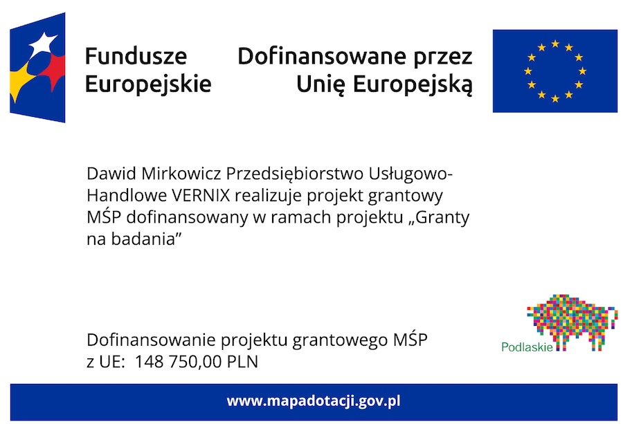 Dawid Mirkowicz Przedsiębiorstwo Usługowo – Handlowe VERNIX realizuje projekt zgodnie z umową o powierzenie grantu nr GRANT3/68 zawartą dnia 17 grudnia 2025 r. Grant udzielany jest ze środków Funduszy Europejskich dla Podlaskiego na lata 2021-2027, w ramach projektu „Granty na badania”. Celem projektu jest przeprowadzenie usługi badawczej polegającej na przeprowadzeniu prac badawczo-rozwojowych dotyczących opracowania specjalistycznej konstrukcji zabudowy podwozia typu camper.