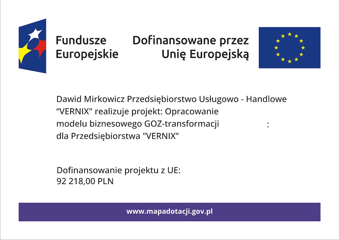 Dawid Mirkowicz Przedsiębiorstwo Usługowo – Handlowe “VERNIX”, uzyskała dotację z Unii Europejskiej na projekt Opracowanie modelu biznesowego GOZ-transformacji dla Przedsiębiorstwa “VERNIX”.